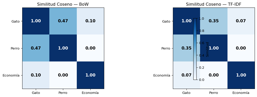 Similitud Coseno — BoW vs TF-IDF: