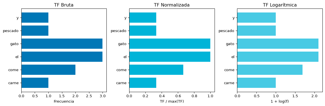 import matplotlib.pyplot as pltimport numpy as npterminos =list(frecuencias.keys())freqs =list(frecuencias.values())max_f =max(freqs)fig, axes = plt.subplots(1, 3, figsize=(12, 4))# TF Brutaaxes[0].barh(terminos, freqs, color='#0077b6')axes[0].set_title('TF Bruta', fontsize=12)axes[0].set_xlabel('Frecuencia')# TF Normalizadatf_norm = [f / max_f for f in freqs]axes[1].barh(terminos, tf_norm, color='#00b4d8')axes[1].set_title('TF Normalizada', fontsize=12)axes[1].set_xlabel('TF / max(TF)')# TF Logarítmicatf_log = [1+ np.log(f) if f >0else0for f in freqs]axes[2].barh(terminos, tf_log, color='#48cae4')axes[2].set_title('TF Logarítmica', fontsize=12)axes[2].set_xlabel('1 + log(f)')plt.tight_layout()plt.show()