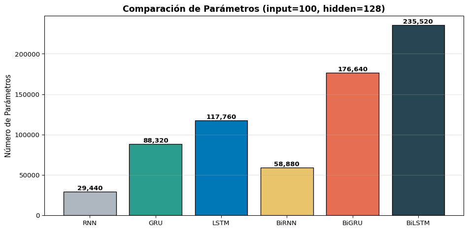 import torch.nn as nnimport matplotlib.pyplot as pltimport numpy as npd, Dh =100, 128models = {'RNN': nn.RNN(d, Dh, batch_first=True),'GRU': nn.GRU(d, Dh, batch_first=True),'LSTM': nn.LSTM(d, Dh, batch_first=True),'BiRNN': nn.RNN(d, Dh, batch_first=True, bidirectional=True),'BiGRU': nn.GRU(d, Dh, batch_first=True, bidirectional=True),'BiLSTM': nn.LSTM(d, Dh, batch_first=True, bidirectional=True),}names =list(models.keys())params = [sum(p.numel() for p in m.parameters()) for m in models.values()]fig, ax = plt.subplots(figsize=(10, 5))colors = ['#adb5bd', '#2a9d8f', '#0077b6', '#e9c46a', '#e76f51', '#264653']bars = ax.bar(names, params, color=colors, edgecolor='black', linewidth=1)for bar, p inzip(bars, params): ax.text(bar.get_x() + bar.get_width()/2., bar.get_height() +2000,f'{p:,}', ha='center', fontsize=10, fontweight='bold')ax.set_ylabel('Número de Parámetros', fontsize=11)ax.set_title(f'Comparación de Parámetros (input={d}, hidden={Dh})', fontsize=13, fontweight='bold')ax.grid(True, alpha=0.3, axis='y')plt.tight_layout()plt.show()