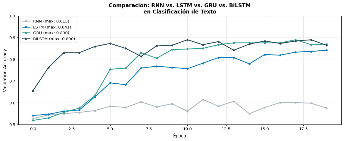import torchimport torch.nn as nnimport numpy as npfrom sklearn.datasets import fetch_20newsgroupsfrom sklearn.model_selection import train_test_splitfrom collections import Counterimport matplotlib.pyplot as plt# ---------- Datos ----------categories = ['sci.space', 'talk.politics.misc']data = fetch_20newsgroups(subset='all', categories=categories, remove=('headers', 'footers'))texts, labels = data.data, data.targetdef simple_tokenize(text, max_len=100):return text.lower().split()[:max_len]all_tokens = [t for text in texts for t in simple_tokenize(text)]word_counts = Counter(all_tokens)vocab_list = ['<pad>', '<unk>'] + [w for w, c in word_counts.most_common(5000)]word2idx = {w: i for i, w inenumerate(vocab_list)}def encode(text, max_len=100): tokens = simple_tokenize(text, max_len) ids = [word2idx.get(t, 1) for t in tokens] ids += [0] * (max_len -len(ids))return idsX = torch.tensor([encode(t) for t in texts])y = torch.tensor(labels)X_train, X_val, y_train, y_val = train_test_split(X, y, test_size=0.2, random_state=42)train_ds = torch.utils.data.TensorDataset(X_train, y_train)train_loader = torch.utils.data.DataLoader(train_ds, batch_size=32, shuffle=True)# ---------- Modelo genérico ----------class TextClassifier(nn.Module):def__init__(self, vocab_size, embed_dim, hidden_dim, n_classes, rnn_type='LSTM', bidirectional=False):super().__init__()self.embedding = nn.Embedding(vocab_size, embed_dim, padding_idx=0)self.bidirectional = bidirectionalself.rnn_type = rnn_type rnn_cls = {'RNN': nn.RNN, 'LSTM': nn.LSTM, 'GRU': nn.GRU}[rnn_type]self.rnn = rnn_cls(embed_dim, hidden_dim, batch_first=True, bidirectional=bidirectional) fc_dim = hidden_dim *2if bidirectional else hidden_dimself.fc = nn.Linear(fc_dim, n_classes)self.dropout = nn.Dropout(0.3)def forward(self, x): emb =self.embedding(x) out =self.rnn(emb)ifself.rnn_type =='LSTM': _, (h_n, _) = outelse: _, h_n = outifself.bidirectional: h = torch.cat([h_n[0], h_n[1]], dim=1)else: h = h_n.squeeze(0)returnself.fc(self.dropout(h))# ---------- Entrenar ----------configs = [ ('RNN', 'RNN', False), ('LSTM', 'LSTM', False), ('GRU', 'GRU', False), ('BiLSTM', 'LSTM', True),]all_results = {}for name, rnn_type, bidir in configs: torch.manual_seed(42) model = TextClassifier(len(vocab_list), 64, 64, 2, rnn_type=rnn_type, bidirectional=bidir) optimizer = torch.optim.Adam(model.parameters(), lr=0.001) criterion = nn.CrossEntropyLoss() val_accs = []for epoch inrange(20): model.train()for xb, yb in train_loader: optimizer.zero_grad() loss = criterion(model(xb), yb) loss.backward() torch.nn.utils.clip_grad_norm_(model.parameters(), 1.0) optimizer.step() model.eval()with torch.no_grad(): val_acc = (model(X_val).argmax(1) == y_val).float().mean().item() val_accs.append(val_acc) all_results[name] = val_accs n_params =sum(p.numel() for p in model.parameters())print(f"{name:>7s} | Params: {n_params:>8,} | Best Val Acc: {max(val_accs):.4f}")# ---------- Gráfica ----------fig, ax = plt.subplots(figsize=(12, 5))colors = {'RNN': '#adb5bd', 'LSTM': '#0077b6', 'GRU': '#2a9d8f', 'BiLSTM': '#264653'}for name, accs in all_results.items(): ax.plot(accs, '-o', color=colors[name], label=f'{name} (max: {max(accs):.3f})', linewidth=2, markersize=4)ax.set_xlabel('Época', fontsize=11)ax.set_ylabel('Validation Accuracy', fontsize=11)ax.set_title('Comparación: RNN vs. LSTM vs. GRU vs. BiLSTM\nen Clasificación de Texto', fontsize=13, fontweight='bold')ax.legend(fontsize=10)ax.set_ylim(0.5, 1.0)ax.grid(True, alpha=0.3)plt.tight_layout()plt.show()
