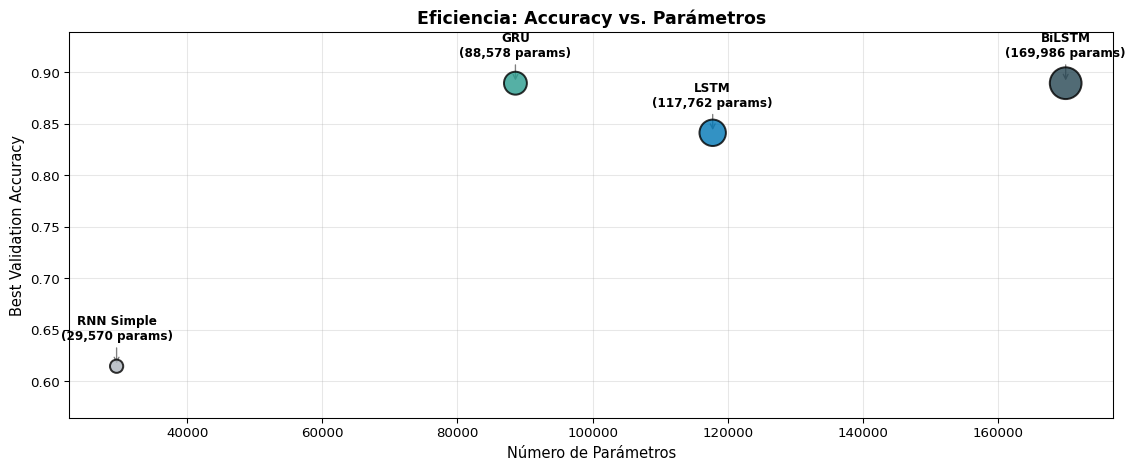 import matplotlib.pyplot as pltimport numpy as npfig, ax = plt.subplots(figsize=(12, 5))models_summary = {'RNN Simple': {'params': 29570, 'best_acc': max(all_results['RNN']), 'color': '#adb5bd'},'LSTM': {'params': 117762, 'best_acc': max(all_results['LSTM']), 'color': '#0077b6'},'GRU': {'params': 88578, 'best_acc': max(all_results['GRU']), 'color': '#2a9d8f'},'BiLSTM': {'params': 169986, 'best_acc': max(all_results['BiLSTM']), 'color': '#264653'},}names =list(models_summary.keys())accs = [v['best_acc'] for v in models_summary.values()]params = [v['params'] for v in models_summary.values()]colors = [v['color'] for v in models_summary.values()]# Bubble chart: x=params, y=acc, size=paramsscatter = ax.scatter(params, accs, s=[p/300for p in params], c=colors, edgecolors='black', linewidth=1.5, alpha=0.8, zorder=5)for name, p, a inzip(names, params, accs): ax.annotate(f'{name}\n({p:,} params)', xy=(p, a), xytext=(0, 20), textcoords='offset points', ha='center', fontsize=9, fontweight='bold', arrowprops=dict(arrowstyle='->', color='gray', lw=1))ax.set_xlabel('Número de Parámetros', fontsize=11)ax.set_ylabel('Best Validation Accuracy', fontsize=11)ax.set_title('Eficiencia: Accuracy vs. Parámetros', fontsize=13, fontweight='bold')ax.grid(True, alpha=0.3)ax.set_ylim(min(accs) -0.05, max(accs) +0.05)plt.tight_layout()plt.show()