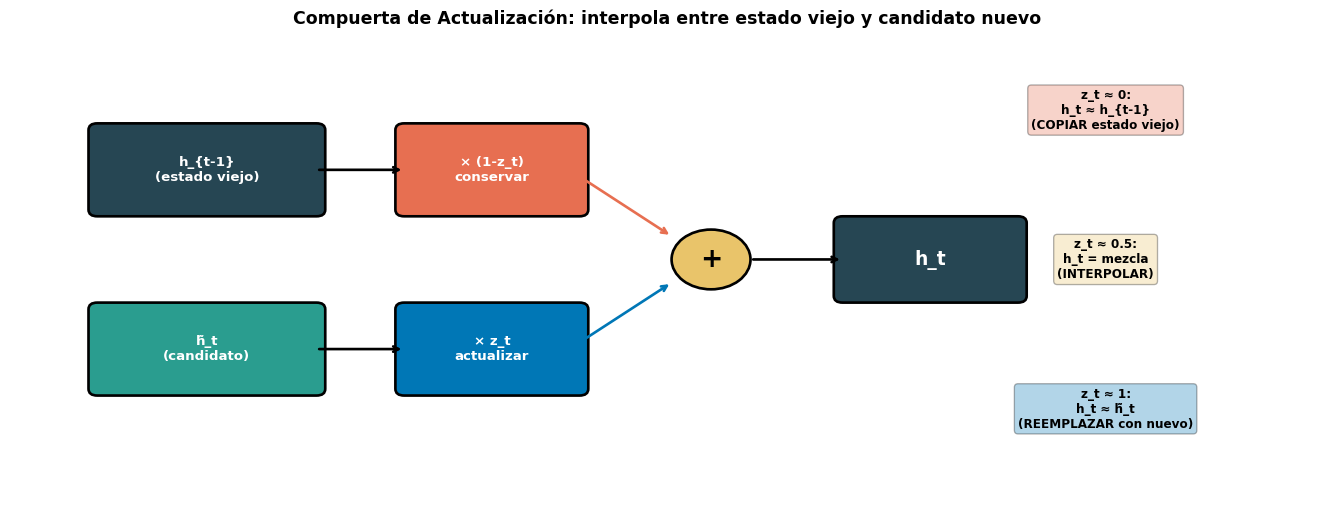 Actualización por interpolación: \(h_t = (1-z_t)h_{t-1} + z_t\tilde{h}_t\)