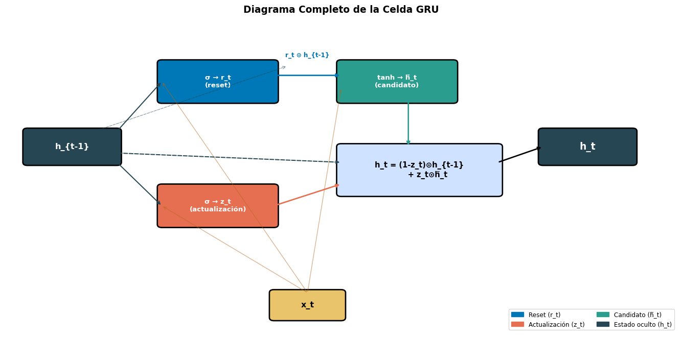 Notemos que \((1-z_t) + z_t = 1\) siempre. Esto significa que el nuevo estado \(h_t\) es una interpolación entre el estado anterior y el candidato. No hay forma de “olvidar todo” y “no escribir nada” — la información siempre se conserva en algún grado.