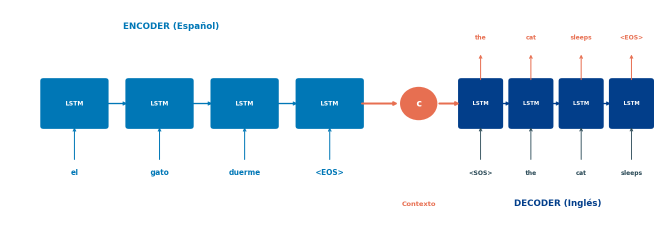 def translate(model, sentence, src_vocab, tgt_vocab, max_len=15):"""Traduce una oración usando greedy decoding""" model.eval()with torch.no_grad(): src = torch.tensor([src_vocab.encode(sentence)]) hidden = model.encoder(src) input_token = torch.tensor([[SOS]]) translated = []for _ inrange(max_len): pred, hidden = model.decoder(input_token, hidden) token_idx = pred.argmax(1).item()if token_idx == EOS:break translated.append(tgt_vocab.idx2token.get(token_idx, "<UNK>")) input_token = torch.tensor([[token_idx]])return" ".join(translated)# Traducir los datos de pruebaprint("="*65)print(f"{'Español':>30s} → {'Traducción':<30s}")print("="*65)for src_sent, tgt_sent in test_pairs: translation = translate(model, src_sent, src_vocab, tgt_vocab) match ="✅"if translation == tgt_sent else"❌"print(f"{src_sent:>30s} → {translation:<25s}{match}")print("\n--- Oraciones del conjunto de entrenamiento ---")for src_sent, tgt_sent in train_pairs[:6]: translation = translate(model, src_sent, src_vocab, tgt_vocab) match ="✅"if translation == tgt_sent else"❌"print(f"{src_sent:>30s} → {translation:<25s}{match}")