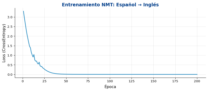 optimizer = optim.Adam(model.parameters(), lr=0.005)criterion = nn.CrossEntropyLoss(ignore_index=PAD)# Aumentar datos repitiendo el corpus (simular más datos)N_EPOCHS =200losses = []torch.manual_seed(42)random.seed(42)for epoch inrange(N_EPOCHS): model.train()# Teacher forcing decrece con el tiempo (scheduled sampling) tf_ratio =max(0.1, 1.0- epoch / N_EPOCHS) output = model(train_src, train_tgt.size(1), train_tgt, teacher_forcing_ratio=tf_ratio) loss = criterion(output.reshape(-1, tgt_vocab.n_tokens), train_tgt.reshape(-1)) optimizer.zero_grad() loss.backward() torch.nn.utils.clip_grad_norm_(model.parameters(), 1.0) optimizer.step() losses.append(loss.item())if (epoch +1) %50==0:print(f"Época {epoch+1:3d}/{N_EPOCHS} | Loss: {loss.item():.4f} | TF ratio: {tf_ratio:.2f}")