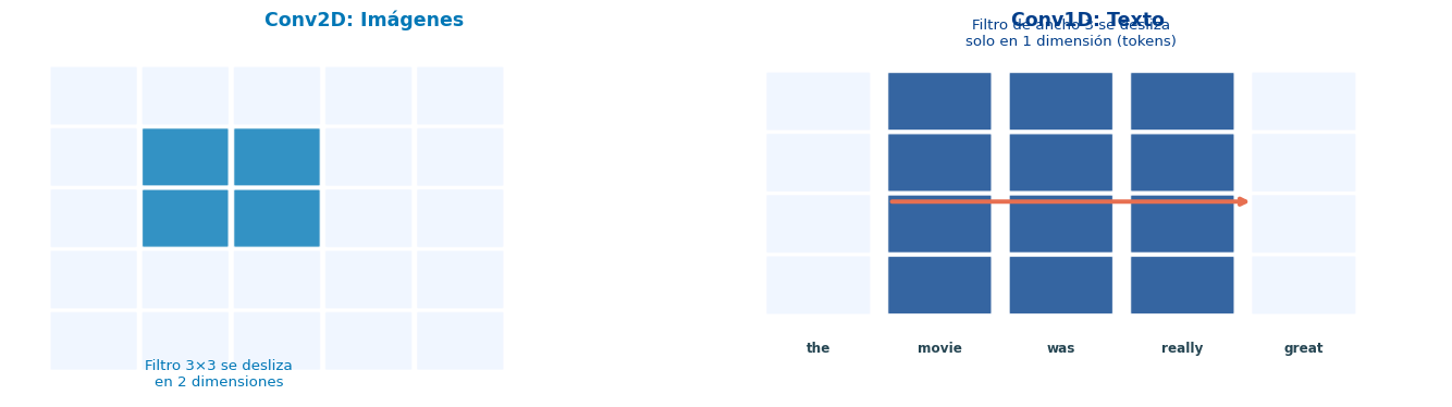 En imágenes, el filtro se mueve en 2D (alto × ancho). En texto, el filtro se mueve solo en 1D (a lo largo de los tokens), cubriendo todas las dimensiones del embedding.