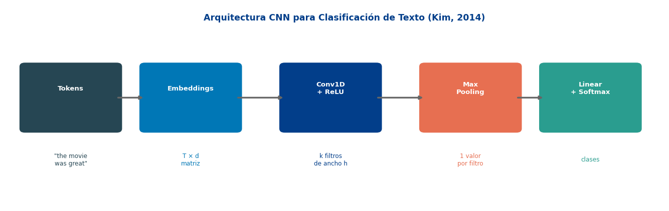class TextCNN(nn.Module):def__init__(self, vocab_size, embed_dim, n_filters, filter_sizes, n_classes, dropout=0.5, pad_idx=0):super().__init__()self.embedding = nn.Embedding(vocab_size, embed_dim, padding_idx=pad_idx)# Una capa Conv1d por cada tamaño de filtroself.convs = nn.ModuleList([ nn.Conv1d(embed_dim, n_filters, kernel_size=k)for k in filter_sizes ])self.dropout = nn.Dropout(dropout)self.fc = nn.Linear(n_filters *len(filter_sizes), n_classes)def forward(self, x):"""x: (batch, seq_len) — índices de tokens""" emb =self.embedding(x) # (batch, seq_len, embed_dim) emb = emb.permute(0, 2, 1) # (batch, embed_dim, seq_len)# Aplicar cada filtro + ReLU + max pooling global conv_outs = []for conv inself.convs: h = torch.relu(conv(emb)) # (batch, n_filters, seq_len - k + 1) h = h.max(dim=2).values # (batch, n_filters) ← max pooling conv_outs.append(h)# Concatenar todos los filtros cat = torch.cat(conv_outs, dim=1) # (batch, n_filters * len(filter_sizes)) cat =self.dropout(cat)returnself.fc(cat) # (batch, n_classes)# Ejemplomodel_cnn = TextCNN(vocab_size=5000, embed_dim=100, n_filters=64, filter_sizes=[2, 3, 4, 5], n_classes=2)x_demo = torch.randint(0, 5000, (8, 30)) # batch=8, longitud=30out = model_cnn(x_demo)print(f"Entrada: {x_demo.shape}") # (8, 30)print(f"Salida: {out.shape}") # (8, 2)print(f"\nParámetros por componente:")total =0for name, param in model_cnn.named_parameters(): total += param.numel()print(f" {name:30s}{str(list(param.shape)):20s} → {param.numel():>8,}")print(f" {'TOTAL':30s}{'':20s} → {total:>8,}")