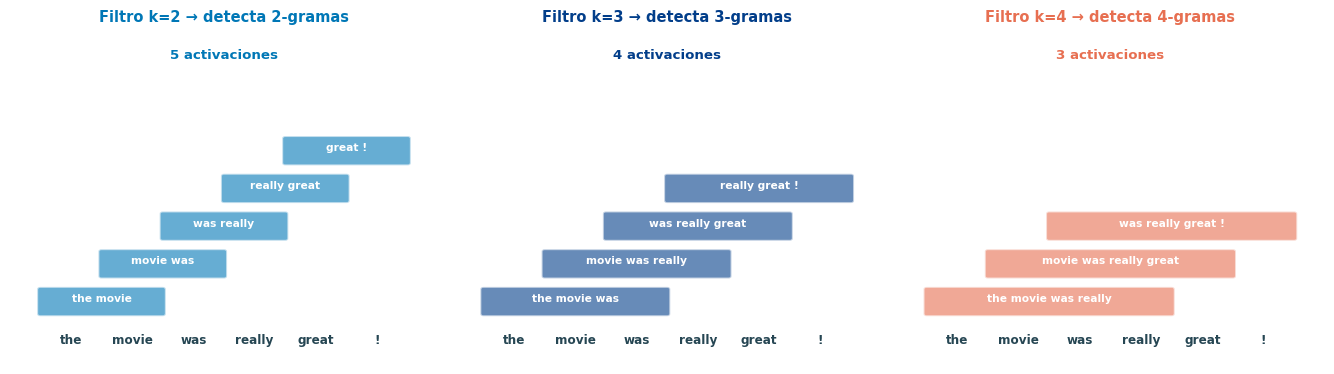 Usando filtros de diferentes anchos simultáneamente (\(k=2,3,4,5\)), el modelo puede capturar bigramas, trigramas, y patrones más largos al mismo tiempo.